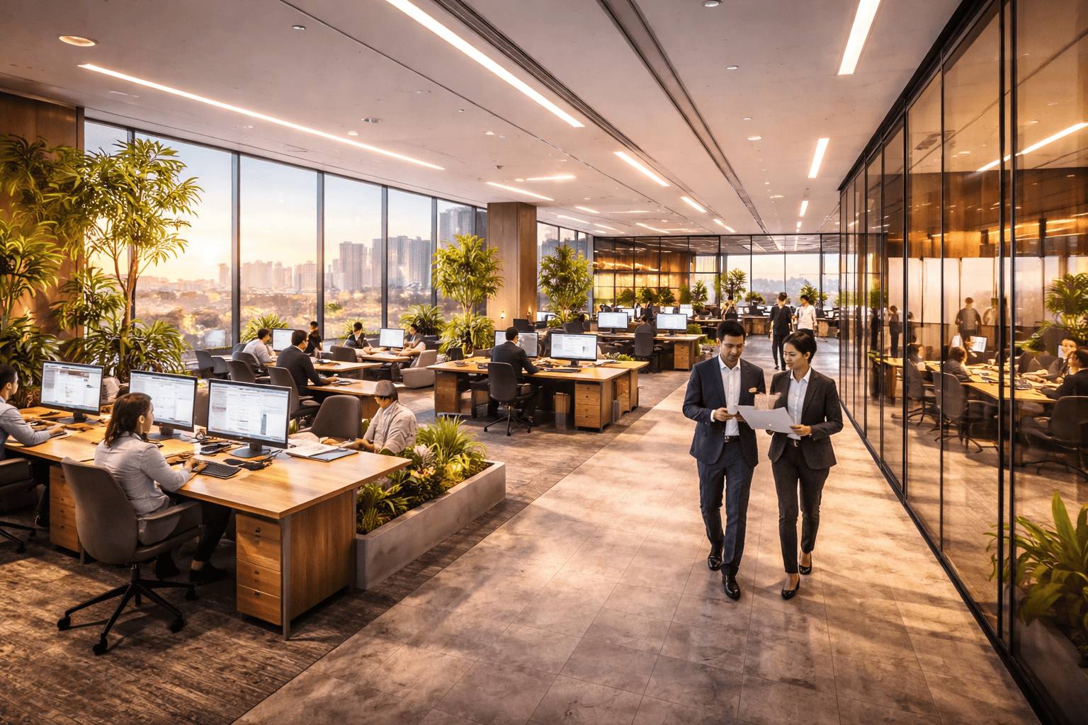 High-speed elevators are planned for vertical circulation. This ensures smooth office operations.